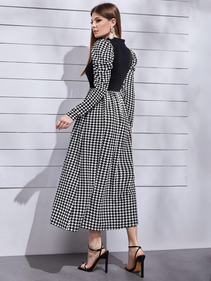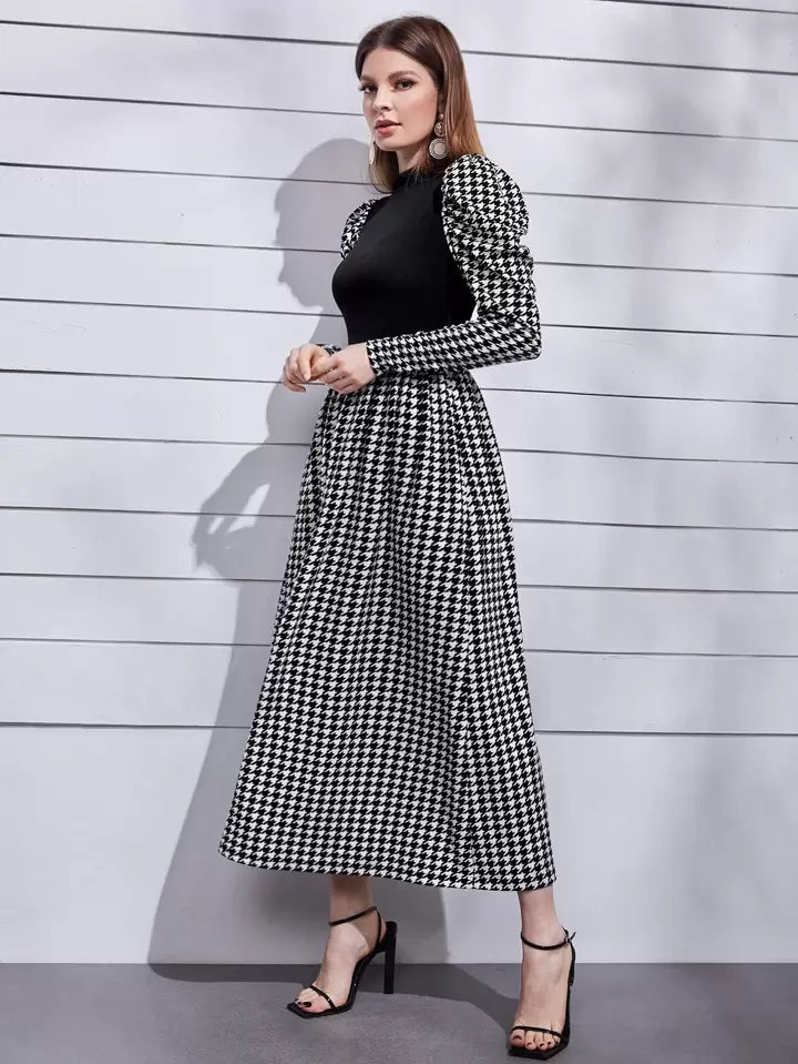 Houndstooth Print Puff Sleeve Long Dress