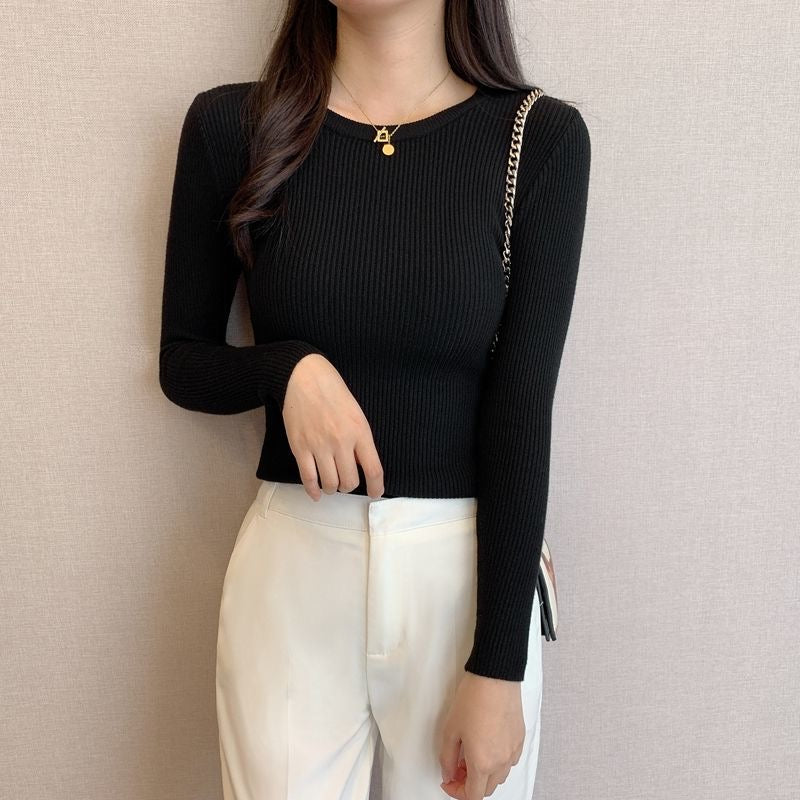 Solid coloured round neck ribbed knit t-shirt with long sleeves.